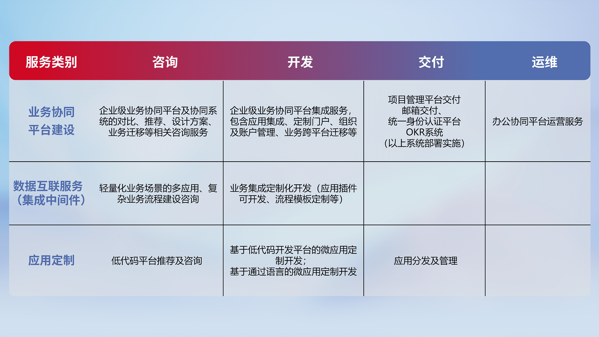 针对钉钉、、、、企微、、IDaas等平台级产品提供产品的规划、、、方案、、、交付、、、定制化开发等服务,,,,实现如统一协同办公、、、、智能客户服务、、、混合会议管理、、智能数据查询、、、、等业务场景,,实现数字化转型。。。。
